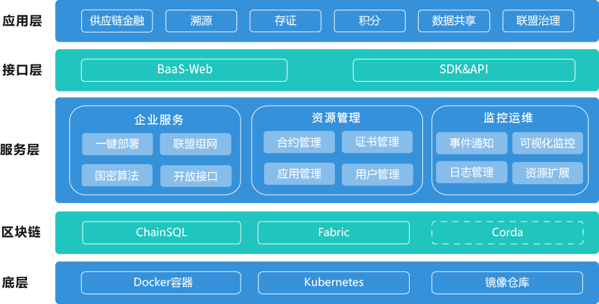 支持Fabric、ChainSQL、Ethereum和Corda等區塊鏈技術底層;支持多鏈集成及擴展