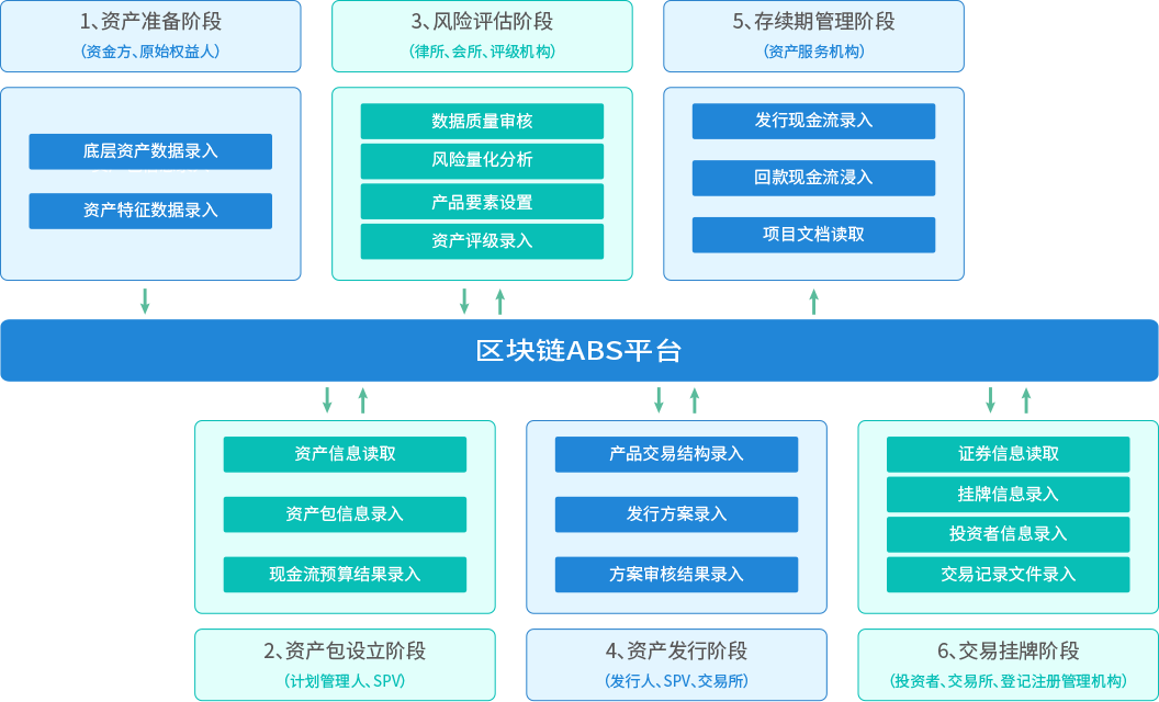 方案以聯盟鏈為支撐,覆蓋資產證券化全流程,包含了資產包管理、資產發行管理、 資產風險管理、現金流管理和資產掛牌管理等主要功能。